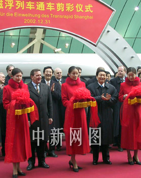 中新網(wǎng)12月31日電 世界第一條磁浮商業(yè)示范線——上海磁浮列車線今天上午試運(yùn)行通車,國務(wù)院總理朱镕基和正在中國訪問的德國總理施羅德親臨現(xiàn)場,為上海磁浮列車示范運(yùn)營線試運(yùn)行通車剪彩,并一同乘坐了首發(fā)的磁浮列車。