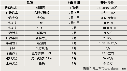 7月份上市的新車型中聚集了眾多知名大品牌。譬如一汽大眾、進口大眾、廣汽豐田等。而按照車型細分,其中涵蓋小型車、緊湊級車、以及中級車備受關注的SUV車型等,其中自足品牌占據(jù)了一半,達到了6款車型,分別是江淮和悅優(yōu)雅版比亞迪M6和F6 1.8;威姿V1;新駿捷;風行景逸,合資車型一汽大眾CC;新雅力士;三菱翼神;晶銳,進口車型鈴木凱澤西;尚酷R-line,共計12款車型。