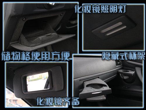 在燈光調(diào)節(jié)的下方設(shè)計有獨(dú)立的儲物空間;副駕駛位置在銀色提示條下隱藏著兩個水杯架;兩側(cè)的遮陽板都設(shè)有化妝鏡,并配有獨(dú)立的照明燈;