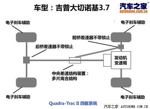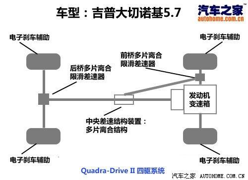 大切諾基采用前后整體橋的非獨(dú)立懸掛,這在結(jié)構(gòu)在本身上也偏重越野。進(jìn)入國(guó)內(nèi)的大切諾基有兩款車型,排量分別為3.7升和5.7升,兩款車型采用的四驅(qū)結(jié)構(gòu)并不相同,主要體現(xiàn)在3.7升車型前后軸上沒(méi)有差速鎖,盡管它的電子輔助系統(tǒng)也足夠強(qiáng)大,但在通過(guò)一些難度較大的交叉軸項(xiàng)目時(shí),電子輔助還是比機(jī)械結(jié)合反應(yīng)緩慢一些。