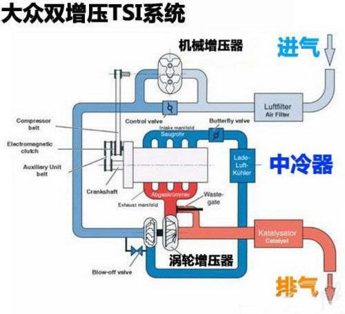 大眾TSI的含義:即Turbo-charging(渦輪增壓)、Super-charging(機(jī)械增壓)和Injection(燃油直噴)三個(gè)關(guān)鍵特色的首字母縮寫。也就是說(shuō),原汁原味的TSI,應(yīng)當(dāng)是具備三大技術(shù)的——渦輪與機(jī)械的復(fù)合增壓,加上缸內(nèi)直噴技術(shù)。
