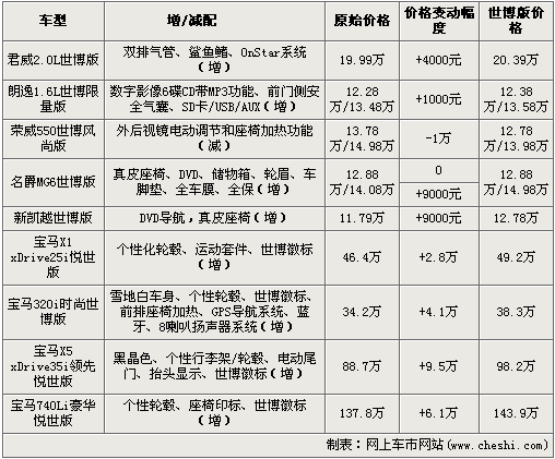 不同品牌共推出9款世博版車(chē)型,范圍從自主到進(jìn)口,從緊湊級(jí)到頂級(jí)豪華車(chē),體現(xiàn)出世博這一世界人類(lèi)盛會(huì)的巨大影響力。車(chē)型全部采用增加或較少配置的做法進(jìn)行改款,最高價(jià)格漲幅達(dá)到了9.5萬(wàn),降價(jià)車(chē)型只有一款,降幅為1萬(wàn)。