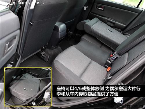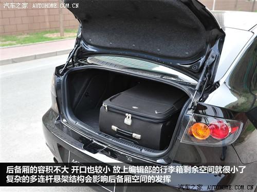 馬自達3后備箱容積不大甚至讓我感覺有些小,而且離地較高,女士在向后備箱裝較重物品時會比較費勁;不過后排座椅可以以4:6的比例放倒,如果偶爾搬運大件行李,這樣的設計會有所幫助,但是我認為能力還是有限。