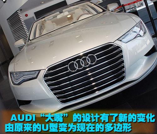 在正面特征上,概念車仍然具備奧迪標(biāo)志性的的“大嘴”進(jìn)氣格柵。但是略加觀察您也會(huì)發(fā)現(xiàn)這款概念車的進(jìn)氣格柵又目前國(guó)產(chǎn)A6L的U型改變?yōu)榱祟愃朴诙噙吿菪蔚男螤。而“奧迪四個(gè)圈”的LOGO位置也設(shè)計(jì)的比較靠上而不是中間或是下方。