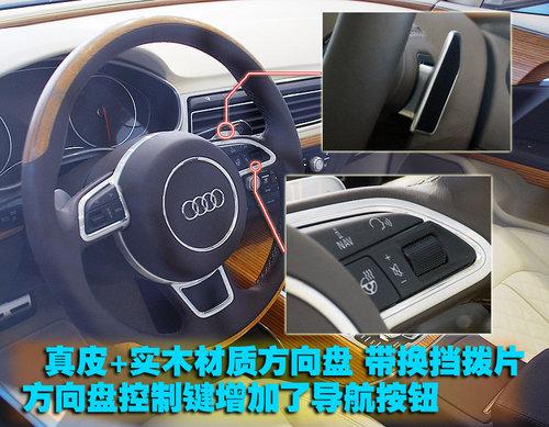 方向盤部分能夠看到奧迪專為跑車化而設(shè)計的三幅運動型方向盤,通常A8的方向盤是更加舒適化的4幅方向盤。真皮縫制與實木材料的應(yīng)用是奧迪為豪華車市場專門打造的。在這里我們發(fā)現(xiàn)了以前奧迪并未在方向盤上安裝的“Nav”即導航按鈕。