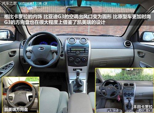 比亞迪F3的內(nèi)飾可以說是豐田花冠的翻版,因?yàn)槌朔较虮P的造型不同之外并沒有其他不同,便宜的售價(jià)也限制了用料和材質(zhì);作為F3升級產(chǎn)品的G3,在內(nèi)飾方面也同樣由花冠升級為卡羅拉,但并沒有照搬過來,比如空調(diào)出風(fēng)口的變化就顯得比原型車更加時(shí)尚,四輻方向盤也明顯帶有豐田凱美瑞的影子。