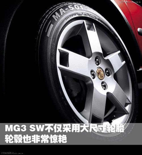 第一眼看到MG3sw,我們就會被純正的英式風(fēng)格所震撼。在MG3sw的車頭部分,我們可以看到很多分體設(shè)計(jì)的元素,前大燈、霧燈、中網(wǎng)都采用了對稱的排列方式,在蘊(yùn)含動感的同時也有一絲紳士風(fēng)范。車頭和車尾低平而飽滿,引擎蓋上3道線條均勻地勾勒出一種力量感。最小離地間隙大于160mm的高通過性底盤,與車身顏色不同的全身大包圍,都表現(xiàn)出了MG3sw所具有的通過能力。