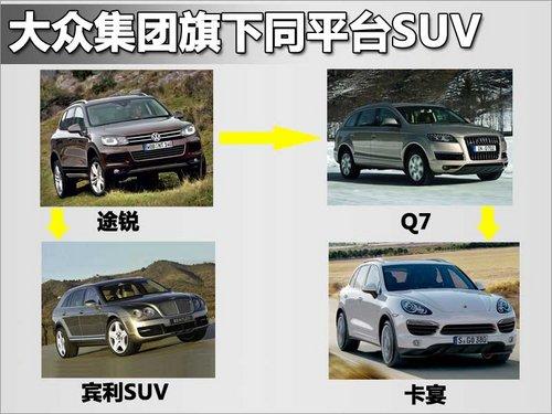 大眾集團(tuán)旗下?lián)碛卸鄠高端以及豪華品牌,例如蘭博基尼、保時捷、布加迪還有賓利。其中布加迪、賓利、保時捷在產(chǎn)品上更多的受到了大眾品牌在技術(shù)上的影響。而在SUV產(chǎn)品方面也亦如此,最為明顯的例子在于大眾途銳、保時捷卡宴、奧迪Q7的相同平臺、部分技術(shù)以及零件的共通化就為三款車型帶來了更小的研發(fā)成本和更短的研發(fā)時間。