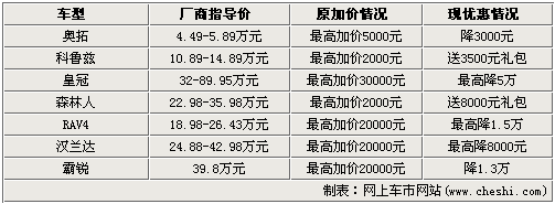 從上面統(tǒng)計的7款車型來看,其中皇冠創(chuàng)出最大差價,上市之后曾最高加價3萬元,而目前最高降幅已達5萬元。而SUV車型也是市場加價的主力,森林人、RAV4、漢蘭達、霸銳等都在上市后出現(xiàn)加價情況,除森林人只有2000元之外,其他都普遍加價2萬元,不過隨著市場競爭的激烈,最高降幅已達1.5萬元。