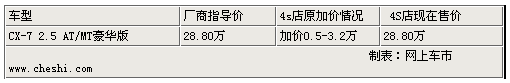 作為一款具有跑車化外觀和馬自達(dá)操控DNA的中型SUV,馬自達(dá)CX-7自去年11月上市以來一直備受關(guān)注。根據(jù)網(wǎng)上車市價(jià)格監(jiān)測系統(tǒng)顯示,自CX-7上市以來,各4S店一直持續(xù)提現(xiàn)車加價(jià)0.5萬-3.2萬元,而近期北京馬自達(dá)4S店出現(xiàn)了平價(jià)銷售現(xiàn)象,售價(jià)為廠商指導(dǎo)價(jià)28.8萬,少量現(xiàn)車供應(yīng)。具體車型價(jià)格如下: