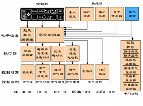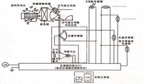 全自動(dòng)溫度控制系統(tǒng)的組成包括溫度傳感器、控制系統(tǒng)ECU、執(zhí)行機(jī)構(gòu)等。其中溫度傳感器有車外氣體溫度傳感器、車內(nèi)氣體溫度傳感器、日照傳感器(陽(yáng)光強(qiáng)度傳感器)和蒸發(fā)器溫度傳感器。