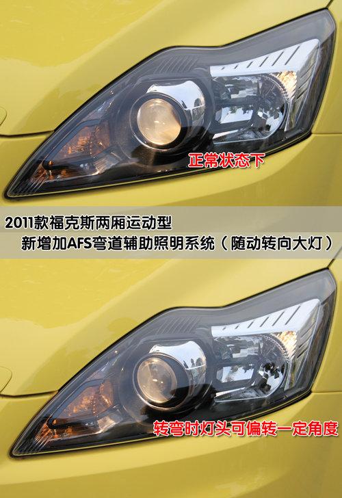 2011款?怂箖蓭\動型在安全配飾上新增加了AFS彎道輔助照明系統(tǒng),AFS是彎道輔助照明系統(tǒng)的縮寫(俗稱彎道大燈)。AFS系統(tǒng)有三種形式:1、轉(zhuǎn)向頭燈形式的,就是頭燈內(nèi)燈具可以左右旋轉(zhuǎn)8°至15°照明彎道死角。 2、利用獨立彎道照明系統(tǒng)的,就是在燈具里有一個固定的燈泡照向彎道,轉(zhuǎn)彎時候自動點亮。3、利用左右霧燈進行彎道時候照明,轉(zhuǎn)向時候?qū)獜潈?nèi)側(cè)霧燈亮起,照明彎道死角。而2011款福克斯兩廂運動型采用的是第一種形式,增強了夜晚行車的安全性。