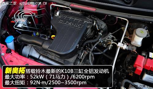 新奧拓搭載了鈴木最新開發(fā)的K10B全鋁發(fā)動機,最大功率71Ps/6200rpm,最大扭矩92N·m/2500-3500rpm,低轉(zhuǎn)速區(qū)間即可輸出較高的扭矩,發(fā)動機調(diào)教很適合城市駕駛,發(fā)動機采用正時鏈條傳動,終身免更換;另外這款發(fā)動機的燃油經(jīng)濟性非常出色。