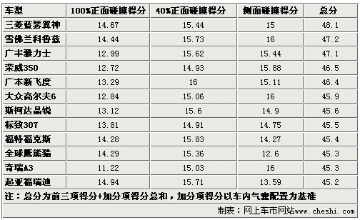 通過以上表格,我們可以看出這樣一個(gè)現(xiàn)象,12款車當(dāng)中涉及自主品牌、日韓系列和德美系列各國車型。很多人一直堅(jiān)信德美系的車要比其他兩類車要結(jié)實(shí),但事實(shí)證明他們的成績也并非那么無懈可擊?磥鞢-NCAP的鐵證也可以做一回流言終結(jié)者了,不過這12款車全部達(dá)到了45分以上,也就是C=NCAP五星級(jí)安全標(biāo)準(zhǔn)。至于傳說中的五星半級(jí)別,在比較常見的國產(chǎn)車中只有雅閣和CR-V達(dá)到。