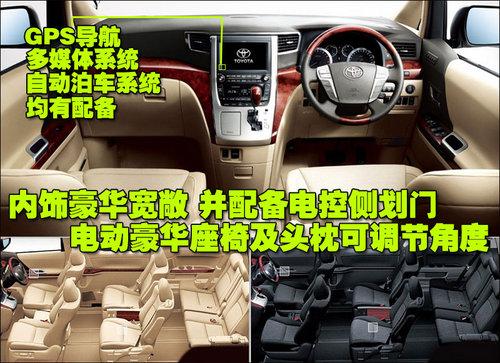 在配置方面,豐田Alphard高配版配備了電動(dòng)控制的側(cè)滑門、中置式大型電動(dòng)天窗、內(nèi)置GPS導(dǎo)航及硬盤的多媒體系統(tǒng)、6碟DVD/CD影音系統(tǒng)帶8喇叭、自動(dòng)泊車系統(tǒng)、前后泊車?yán)走_(dá)。車廂內(nèi)飾則提供了米色與黑色兩種內(nèi)裝顏色供用戶選擇。