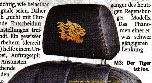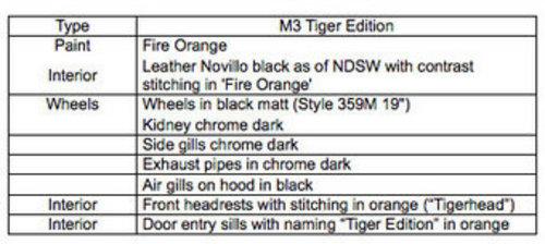 外觀方面,M3 Tiger特別版的進(jìn)氣格柵、反光鏡邊緣都使用了黑色,而車輪部分也升級為寶馬的359M系列(16輻)運(yùn)動(dòng)化鍛造黑色19英寸輪轂,配合銀色的鍍鉻排氣管。內(nèi)飾部分,M3 Tiger紀(jì)念版的內(nèi)飾為黑色真皮坐椅,對應(yīng)火焰橙的走線。