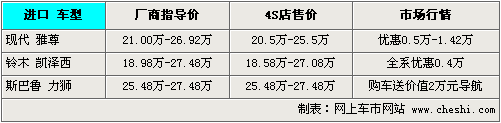 在20—30萬(wàn)的價(jià)格區(qū)間內(nèi),可以說(shuō)進(jìn)口中級(jí)車的可選擇性并不是很多,目前銷量較為突出的則是斯巴魯?shù)牧Κ{車型,目前購(gòu)買可獲贈(zèng)車載導(dǎo)航,而新推出不久的鈴木凱澤西在配置上相當(dāng)完備,近期購(gòu)買可獲得4千元的優(yōu)惠,進(jìn)口現(xiàn)代雅尊則是少數(shù)人的偏愛(ài),但在優(yōu)惠幅度上最高,優(yōu)惠后最低僅售20.5萬(wàn)元。