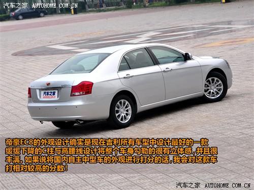 剛才說(shuō)完了我對(duì)這款車的第一印象,下面我再和你說(shuō)說(shuō)我的第二印象:漂亮。請(qǐng)不要認(rèn)為我是帝豪的車托,因此當(dāng)你見(jiàn)到帝豪EC8的時(shí)候也會(huì)對(duì)這款車的優(yōu)美的外形設(shè)計(jì)感到贊嘆。特別是從尾部以45°角看的時(shí)候更會(huì)讓你覺(jué)得它的線條很優(yōu)美。此外,帝豪EC8的C柱設(shè)計(jì)的特別厚實(shí)且平緩,這樣就與后備箱很好的融合在一起。