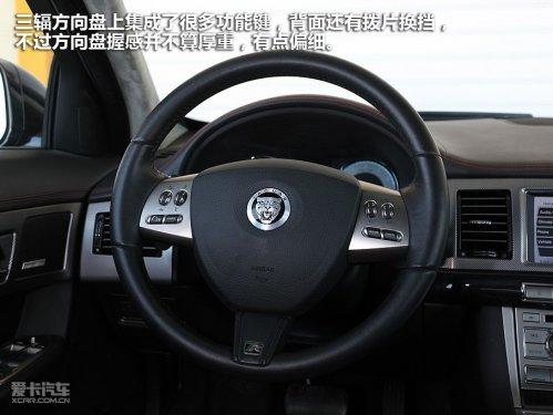 三輻方向盤上集成了很多功能鍵,背面還有撥片換擋,當然,這并不值得大肆稱道,一切都因為這是XFR。如果以駕駛者的角度來挑問題的話,我會嫌方向盤不夠厚重,主要體現(xiàn)在握感上,此時我不由得開始懷念自己車上的R36方向盤。