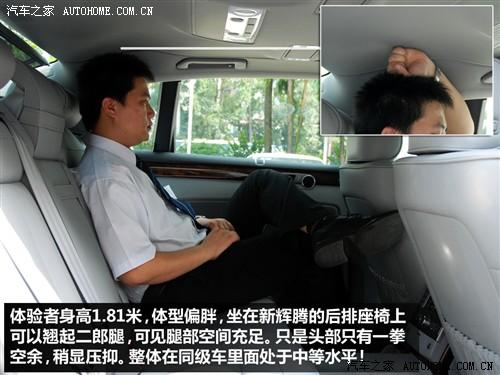 如果你是輝騰的車主那么一定更愿意坐在后排,那么乘坐空間肯定是第一位的,身高181cm的體驗者坐在后排腿部的縱向很充裕,但是受到車頂造型的影響頭部空間沒有想象的大有一拳左右,不過這樣的空間表現(xiàn)如果乘客不是過于挑剔應(yīng)該可會滿意。