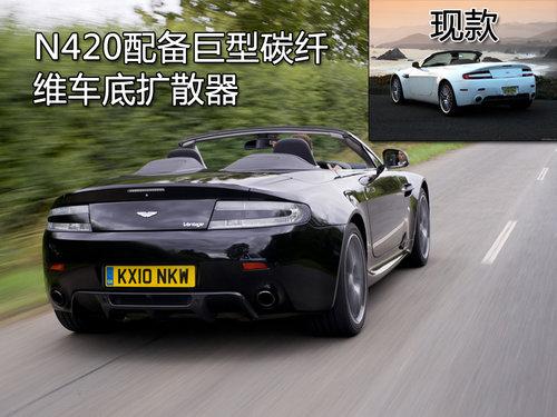 這款V8 Vantage N420敞篷車傳承了眾多賽車元素,阿斯頓馬丁標(biāo)志性的前臉與V8 Vantage Roadster相比并沒(méi)有什么差別。N420前包圍下方增加了一塊碳纖維翼子板,橢圓形頭燈內(nèi)集成有LED日間行車燈。