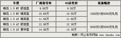 廣汽本田鋒范自上市以來,以全新的造型得到了消費者的極大關注,隨著同級別競爭車型的不斷推出,鋒范在價格上也出現(xiàn)了松動,其中1.8L最高優(yōu)惠幅度達到了6000元,同時還有購車送禮的活動推出,具體行情如下: