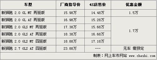 東風(fēng)悅達(dá)起亞獅跑和北京現(xiàn)代途勝屬于同平臺(tái)車型,但相比途勝,獅跑外觀更有活力,F(xiàn)售的09款獅跑在外觀和內(nèi)飾上的改變并不明顯,目前全系車型最高可以優(yōu)惠現(xiàn)金1.7萬,具體行情如下: