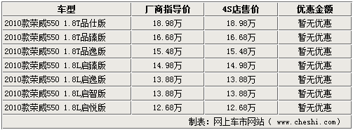 據(jù)銷(xiāo)售人員表示,目前購(gòu)買(mǎi)2010款榮威550車(chē)型僅贈(zèng)送一些保養(yǎng)及裝飾,同時(shí),各店2010款榮威550車(chē)型也比較充裕,顏色齊全,購(gòu)車(chē)用戶(hù)無(wú)需預(yù)訂,其他4S店也基本維持這個(gè)銷(xiāo)售狀態(tài)。而老款550車(chē)型,不論是1.8T還是1.8L車(chē)型均已售空。