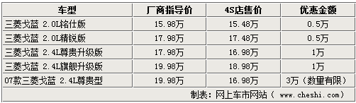 三菱戈藍(lán)2.0L新車已經(jīng)上市了,而銷售境況卻與之前的09款2.4L車型一樣沒有完全鋪開。近日網(wǎng)上車市網(wǎng)站了解到,北京銷售的09款戈藍(lán)售價已經(jīng)由前段時間的優(yōu)惠8000元提升至現(xiàn)在1萬元;而剛剛上市的2.0L戈藍(lán)全系可給出5000元的優(yōu)惠,另外部分商家還有07款的車型,直降3萬元銷售。具體詳情如下: