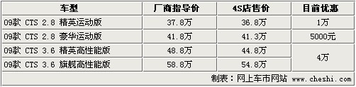 據(jù)4S店銷售人員介紹:目前在售的凱迪拉克09款CTS共有2.8L和3.6L兩個排量車型。這4款車型中,3.6升車型優(yōu)惠幅度較大,2款車可優(yōu)惠4萬元;而2.8升車型優(yōu)惠較少,豪華運動版僅優(yōu)惠5000元。目前3.6升車型為數(shù)不多,喜歡的朋友請盡快與店內(nèi)聯(lián)系。顏色方面,2.8升精英運動版車型有白色、銀色、金色,2.8升豪華運動版有紅色車型,3.6升車型有紅色、灰色車型。另外,年底或明年初將上市新款凱迪拉克CTS,并配備3.0升直噴發(fā)動機(jī),對此車感興趣的朋友請隨時關(guān)注。