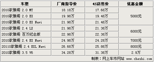 雅閣一直是中級(jí)車市場(chǎng)最受矚目的車型之一,棱角分明的外觀以及舒適的內(nèi)飾空間以及豪華程度成為眾多商務(wù)人士最佳選擇。廣州本田在推出2010款車型后,使雅閣整車的性價(jià)比進(jìn)一步提升。據(jù)網(wǎng)上車市價(jià)格監(jiān)測(cè)系統(tǒng)顯示:目前雅閣的優(yōu)惠幅度有所降低,最高優(yōu)惠2.9萬(wàn)元。具體車型行情如下: