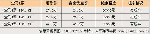 近日筆者從北京亞運(yùn)村交易市場(chǎng)獲悉,目前購(gòu)買寶馬1系轎車最高可享受3.5萬(wàn)元的現(xiàn)金優(yōu)惠,具體價(jià)格見下表: