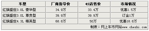 據(jù)紅旗盛世4S店銷售人員介紹,很多紅旗汽車的愛好者一直很關(guān)注盛世的情況,到店看車的消費(fèi)者也多。目前紅旗盛世車型3.0L豪華型有少量現(xiàn)車,4.3L精英型僅有兩臺(tái)現(xiàn)車,3.0L尊貴型暫時(shí)沒有現(xiàn)車。如有意購(gòu)買3.0L尊貴型可以預(yù)訂,訂金為1萬元,但是新車到店的時(shí)間不能確定。其他兩款有現(xiàn)車的車型均有不同幅度的優(yōu)惠,購(gòu)買3.0L豪華型可享1.5萬的現(xiàn)金優(yōu)惠,4.3L精英型的降價(jià)幅度較大,達(dá)到了18.8萬,最終售價(jià)僅為50萬元。