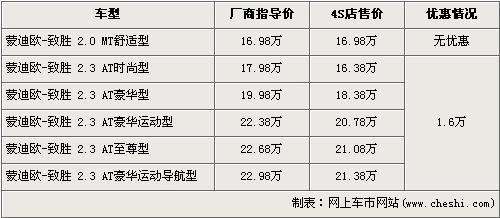 福特蒙迪歐-致勝出自福特最新開發(fā)的EUCD技術(shù)平臺,它采用了沃爾沃S80底盤技術(shù)。在歐洲,蒙迪歐致勝與皇冠成為競爭對手,是一款定位高于雅閣、凱美瑞之流的轎車。近日據(jù)網(wǎng)上車市價格系統(tǒng)檢測顯示,蒙迪歐-致勝現(xiàn)車優(yōu)惠1.6萬元,具體車型價格詳情請看下表: