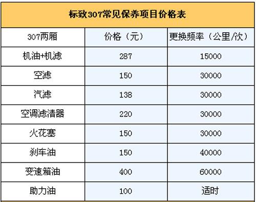 5.保養(yǎng)費(fèi): 我們向標(biāo)致4S店售后服務(wù)人員咨詢過,他們說307一大優(yōu)勢是保養(yǎng)周期比較長,1.5萬公里才需要保養(yǎng)一次,是同級車型中保養(yǎng)花費(fèi)最低的。通常新車首保在7500公里時進(jìn)行,以后每1.5公里保養(yǎng)一次。第二次1.5萬公里時的常規(guī)保養(yǎng)(更換機(jī)油機(jī)濾)需花費(fèi)287元;3萬公里保養(yǎng)(更換機(jī)油機(jī)濾+空濾+空調(diào)濾芯+汽濾+火花塞)為795元;4.5萬公里保養(yǎng)(更換機(jī)油機(jī)濾)花費(fèi)287元;6萬公里保養(yǎng)(更換機(jī)油機(jī)濾+空濾+空調(diào)濾芯+汽濾+火花塞)為795元。
