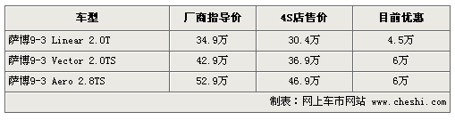 據(jù)4S店銷售人員介紹:目前薩博9-3現(xiàn)車較充足,最高優(yōu)惠可達(dá)6萬(wàn)元,標(biāo)準(zhǔn)型薩博9-3目前優(yōu)惠4.5萬(wàn)。如需訂購(gòu)顏色較少的車,等待時(shí)間在1-2周左右。
