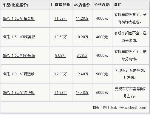 據(jù)廣汽本田4S店銷售人員介紹,目前鋒范有3千元-5千元不等的優(yōu)惠,另外近期購車還將贈送部分裝飾,包括腳墊、座套等可供消費者選擇,F(xiàn)車方面主要以1.5L車型為主,部分顏色及1.8L車型需要提前預(yù)訂,預(yù)訂訂金為1000元,7月左右可以提到現(xiàn)車。北京地區(qū)各4S店由于訂單不同,各店銷售的現(xiàn)車顏色有所不同。