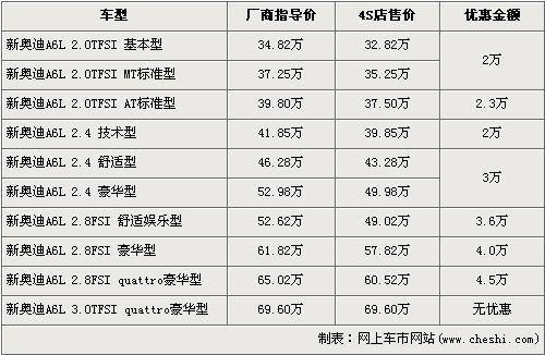 據(jù)4S店銷售人員介紹,目前奧迪A6L全系可以最高優(yōu)惠4.5萬(wàn)元。奧迪A6L全系分為2.0TFSI,2.4L,2.8FSI,3.0TFSI四種共10個(gè)車型,最低配的2.0TFSI基本型經(jīng)2萬(wàn)元優(yōu)惠后售價(jià)從34.82萬(wàn)元下降到了32.82萬(wàn)元,而2.8TSI quattro豪華版經(jīng)全系最高的4.5萬(wàn)元優(yōu)惠后售價(jià)也降到了60.52萬(wàn)元。全系最高配的3.0TFSI quattro豪華版目前店內(nèi)沒(méi)有現(xiàn)車,欲購(gòu)買的消費(fèi)者需要交1萬(wàn)元訂金,約等3個(gè)月后方可提車。