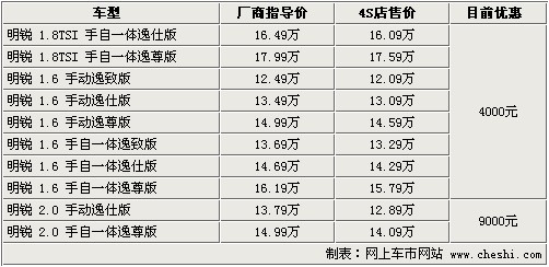 據(jù)4S店銷售人員介紹:目前明銳全系最高優(yōu)惠9000元,1.6升及1.8TSI車型優(yōu)惠減少,尤其1.8TSI車型由原來的8500元降至4000元。2.0升目前優(yōu)惠9000元,優(yōu)惠幅度很大,并且2.0升車型有現(xiàn)車,顏色包括銀色、灰色車型。1.6升車型全系現(xiàn)車少,如需預定最短等待1個半月,最長需等3個月時間。目前1.6升車型優(yōu)惠達4000元,1.8TSI的兩款車型優(yōu)惠4000元。如在店內做裝飾還可打折,雖然折后裝飾價格仍有些偏高,但產品質量可以保證。