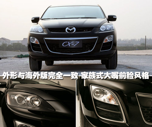前臉采用了馬自達(dá)新一代大嘴設(shè)計(jì),較大的進(jìn)氣格柵以及更加突出的車標(biāo)。前保險(xiǎn)杠中的鍍鉻邊框使CX-7更加時(shí)尚與運(yùn)動(dòng),黑底大燈內(nèi)采用遠(yuǎn)近光分體設(shè)計(jì),近光裝備了透鏡氙燈。
