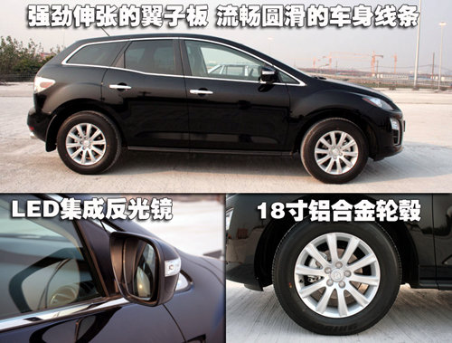 強(qiáng)勁有力的翼子板在車身中部得以適量的過度,其在車尾部再次伸張,配以車窗周圍的鍍鉻裝飾條,賦予了CX-7更為前衛(wèi)的定義。車身整體線條設(shè)計(jì)流暢圓潤,反光鏡集成了LED轉(zhuǎn)向燈,最為顯眼的當(dāng)屬輪轂,CX-7裝配了18寸多幅鋁輪轂,并配備了普利司通高級輪胎,為高速穩(wěn)定性及駕駛安全性起到了關(guān)鍵作用。