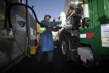 一名工人正在給垃圾車加“氣”