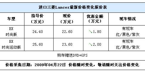 筆者近日從北京港龍基業(yè)經(jīng)銷商處獲悉,進(jìn)口三菱Lancer EX車型保持著最高2萬(wàn)元的優(yōu)惠,并且近期購(gòu)車還將獲贈(zèng)DVD+GPS,現(xiàn)時(shí)尚型和時(shí)尚運(yùn)動(dòng)型現(xiàn)車充足,紅,黑,紫灰等常見顏色均有現(xiàn)車,感興趣的朋友可以與經(jīng)銷商聯(lián)系,詳細(xì)價(jià)格信息請(qǐng)見下表: