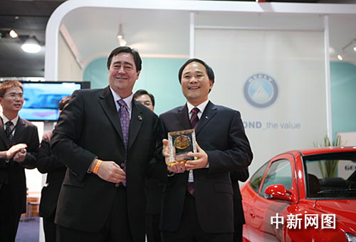 中新網(wǎng)1月16日電 當(dāng)?shù)貢r間1月14日下午,2008底特律車展組委會主席卡爾•加里亞拉來到吉利展臺,將本次展會一份非常特殊的大獎授予吉利集團(tuán)董事長李書福,表彰他多年來領(lǐng)導(dǎo)吉利汽車不斷進(jìn)取、不斷進(jìn)步所取得的非凡成就。