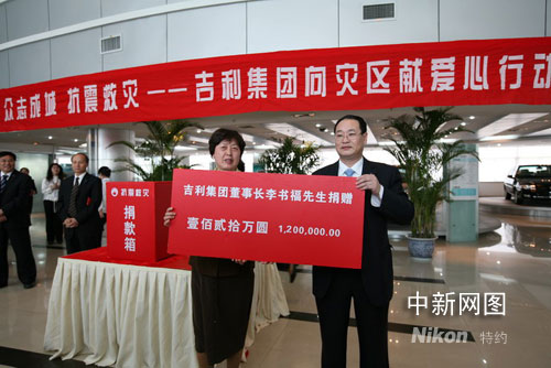 中新網(wǎng)5月14日電 5月12日汶川巨震,震動全國。吉利集團(tuán)在第一時間展開了專題會議,聯(lián)合開展捐車、捐錢、獻(xiàn)血活動,攜經(jīng)銷商、供應(yīng)商首批捐款突破千萬。其中吉利集團(tuán)董事長李書福當(dāng)場個人捐款120萬元,四川省駐浙辦事處領(lǐng)導(dǎo)參加并接受了吉利對災(zāi)區(qū)的捐款。