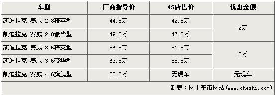 據(jù)4S店銷售人員介紹,目前凱迪拉克SLS賽威全系最高優(yōu)惠5萬元。2.8L分為精英版和豪華版兩個車型,經(jīng)2萬元優(yōu)惠后售價分別降到了42.8萬元和47.8萬元。3.6L車型優(yōu)惠5萬元達(dá)到了全系的最高,優(yōu)惠后3.6精英版售價從56.8萬元下降到了51.8萬元,3.6豪華版售價也從63.8萬元下降到了58.8萬元。