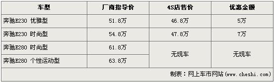 據(jù)4S店銷售人員介紹,奔馳E級現(xiàn)售的車型主要是E230和E280車型,其中E230時尚型的優(yōu)惠幅度為7萬元,達(dá)到了全系的最高,優(yōu)惠后售價從54.8萬元降到了47.8萬元。E230優(yōu)雅型優(yōu)惠5萬元,經(jīng)優(yōu)惠后售價從51.8萬元下降到了46.8萬元。銷售人員還介紹,E280全系店內(nèi)均無現(xiàn)車,所以不在此次降價范圍內(nèi)。