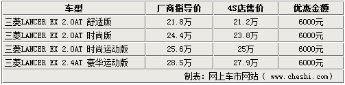 據(jù)經(jīng)銷商透露,由于剛剛經(jīng)歷了召回風(fēng)波,所以基于市場以及銷量等多方面的考慮,才開始優(yōu)惠促銷。除最低配置的舒適版車型各家店內(nèi)均無車需要單獨預(yù)訂外,其他車型均有現(xiàn)車,且顏色齊全。全系LANCER EX車型均在原價基礎(chǔ)上優(yōu)惠6000元,消費者可隨意挑選。
