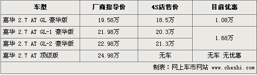 嘉華是起亞在國內(nèi)的首款MPV車型,相比奧德賽、GL8等同級車,嘉華在價格和油耗上有一定的優(yōu)勢,同時空間和配置也完全能夠滿足消費者需求。根據(jù)網(wǎng)上車市價格監(jiān)測系統(tǒng)顯示,目前嘉華全系最高優(yōu)惠1.68萬元,具體行情如下: