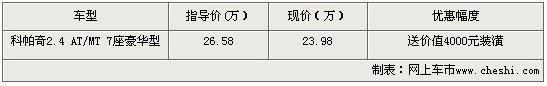 雪佛蘭Captiva科帕奇不僅豐富了雪佛蘭產(chǎn)品陣容,深化了雪佛蘭年輕活力、值得信賴的國際化品牌內(nèi)涵,更填補了上海通用汽車在中檔SUV細分市場上的空白。近日根據(jù)網(wǎng)上車市價格監(jiān)測系統(tǒng)顯示,上海地區(qū)購買雪佛蘭科帕奇2.4 AT/MT 7座豪華型 可以得到2.6萬元的價格優(yōu)惠。具體車型報價如下表: